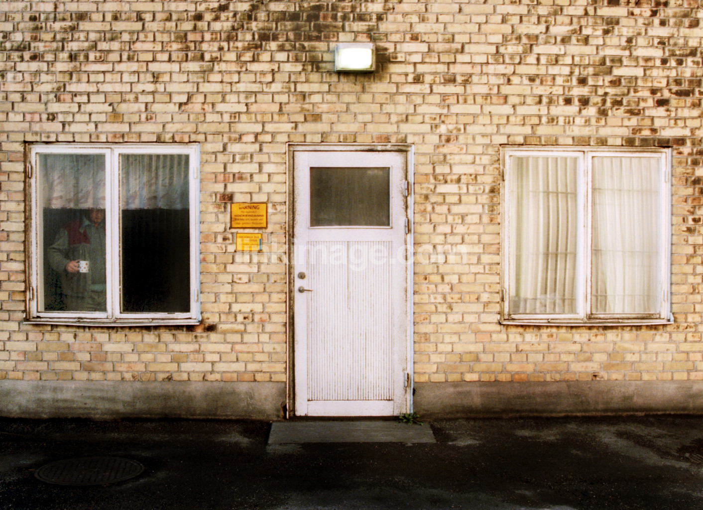 - Brick facade with a man inside a window