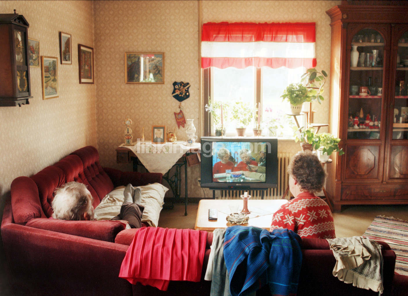 - living, tv, sofa, male, female, room, old woman, couple, watch, program, coffee table, old