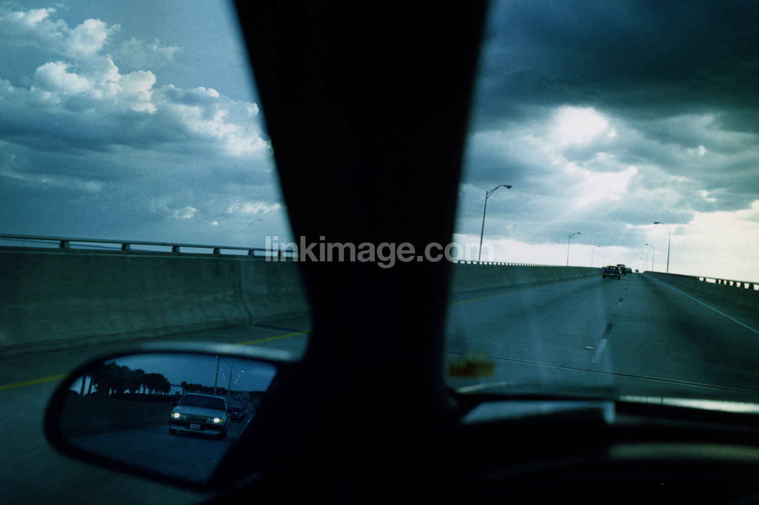 - car, driving, rearview mirror, windshield, road, bridge, cloud, transport, and, communication