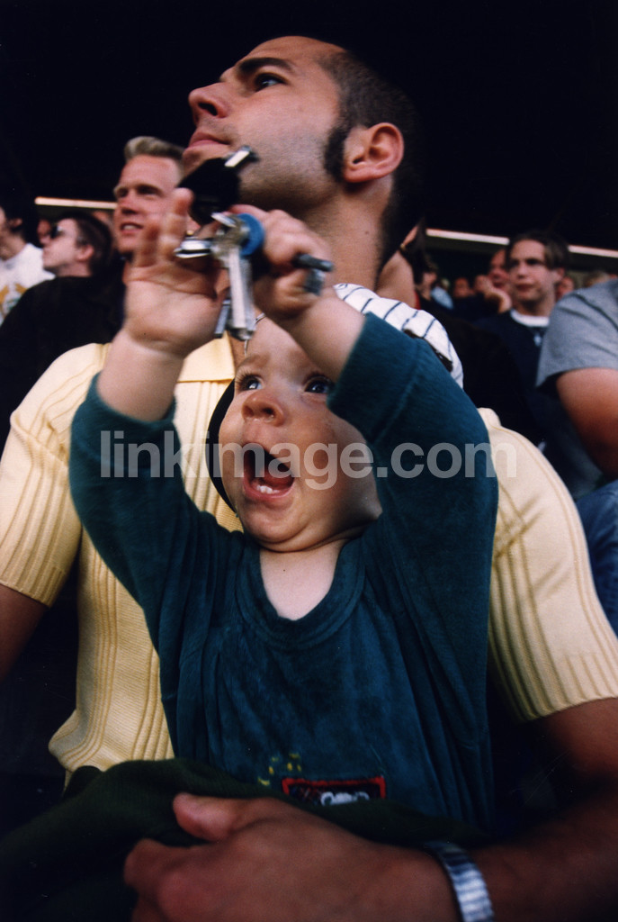 - father, son, children, baby, babysitting, parental leave, football, audience, sports, cheer, fans, support