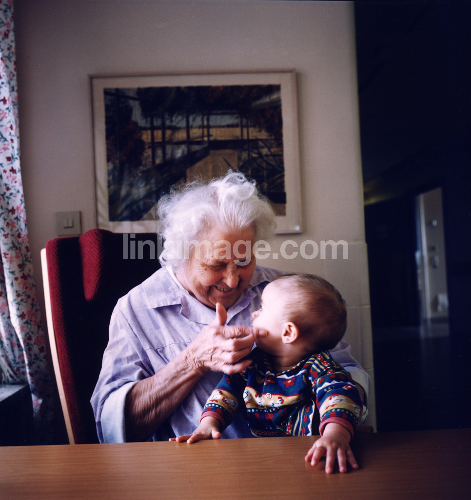 - lady, aunt, children, baby, hold, hug, feel, feelings, tenderness, family, generation, generations, house, room, table, armchair, plate