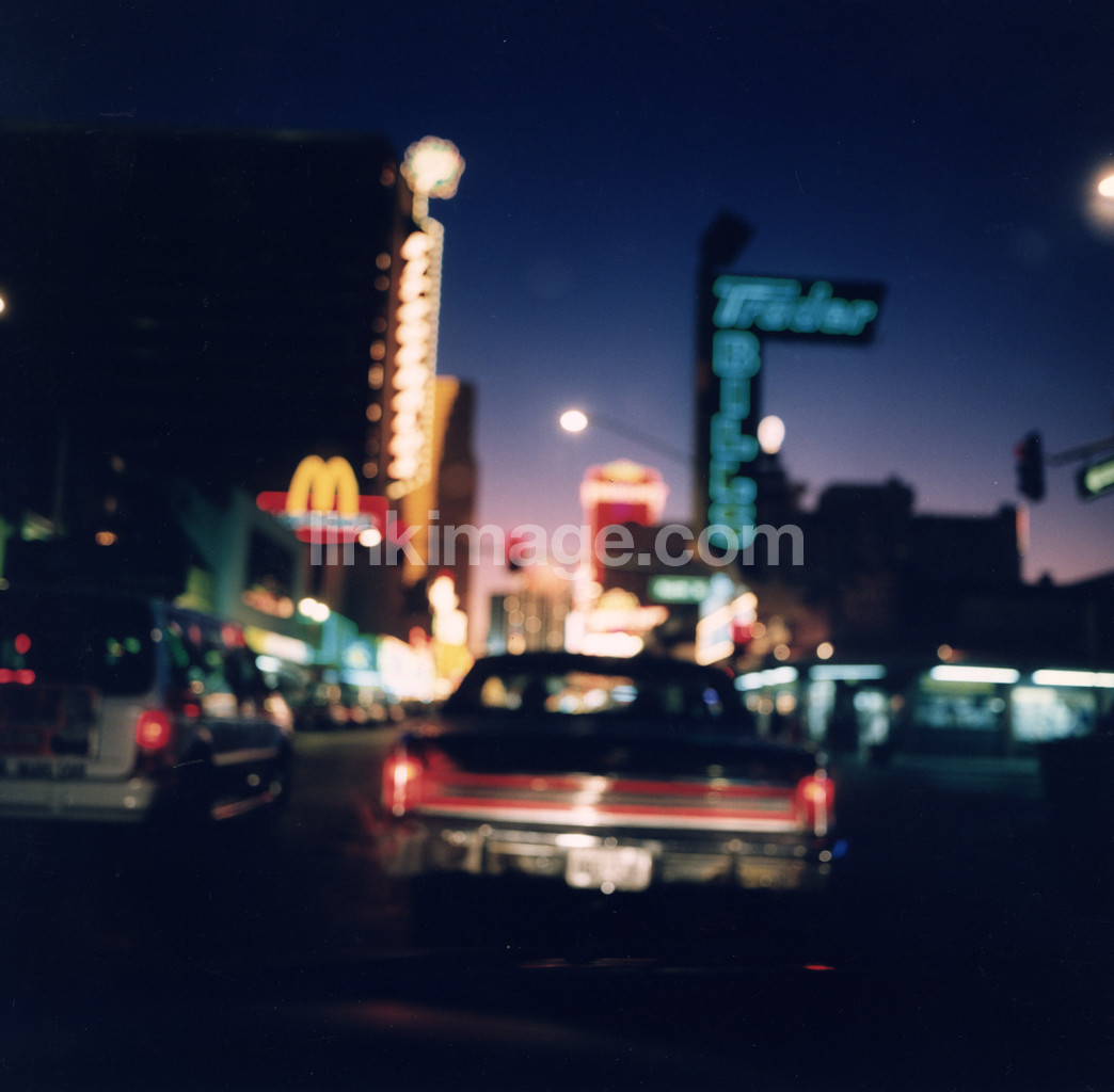 - night, city, metropolitan, dark, car, traffic, neon lights, signs, lampposts, restaurants, stoplight