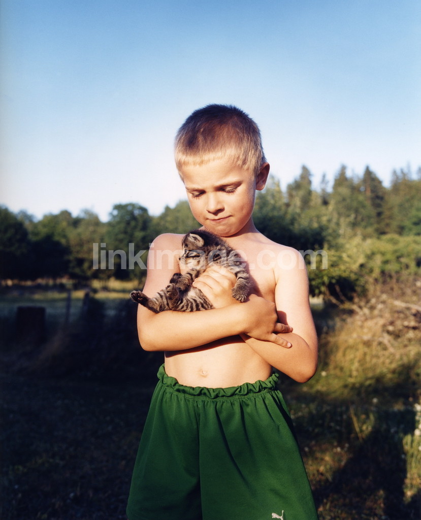 - cat, kitten, boy, pats, tenderness, love, soft, summer, friends