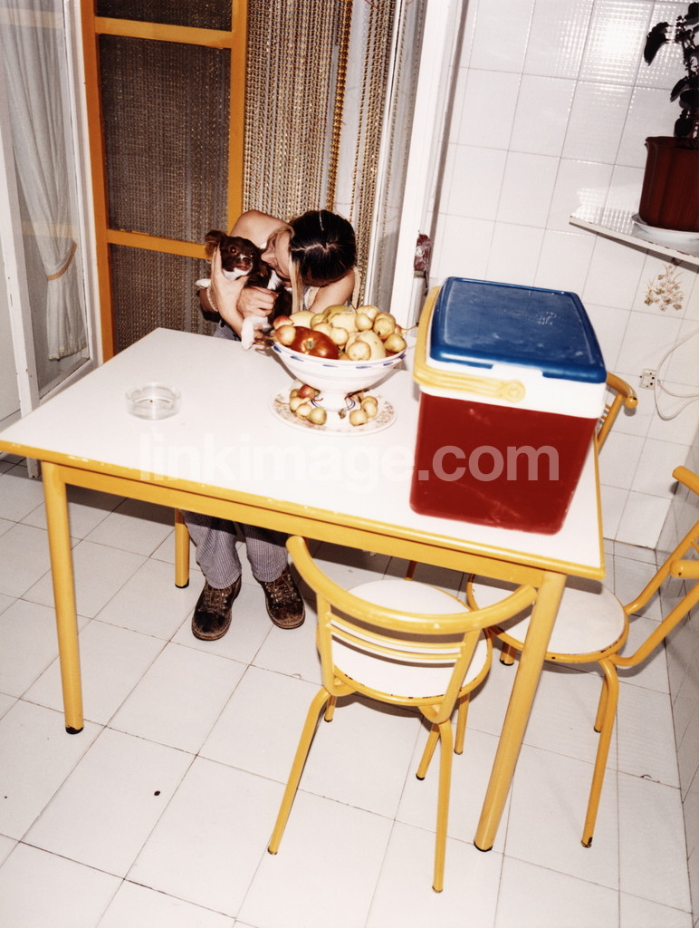 - kitchen, table, chairs, cooler bag, female, dog, apples, fruits