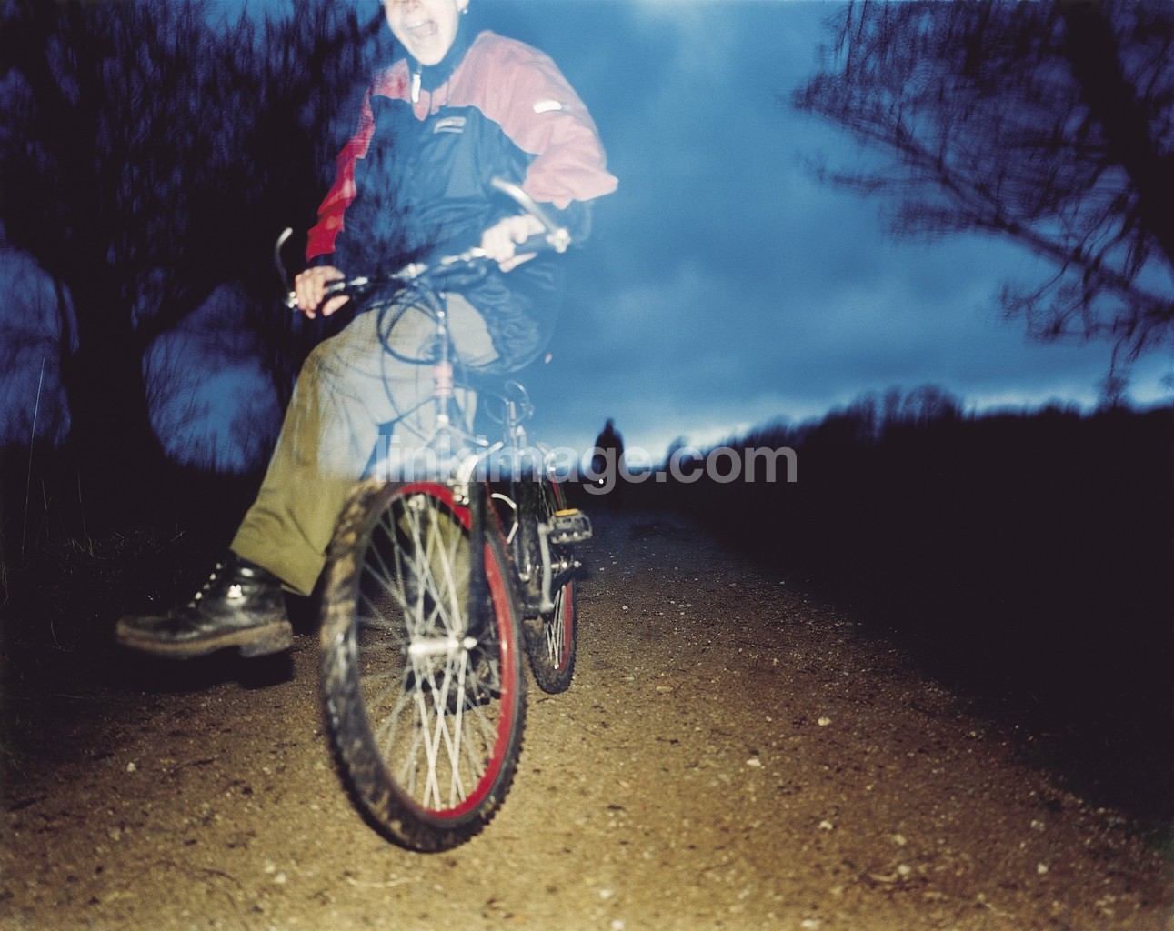 - cycle, mountain bike, play, youth, guy, night, evening, road, gravel road