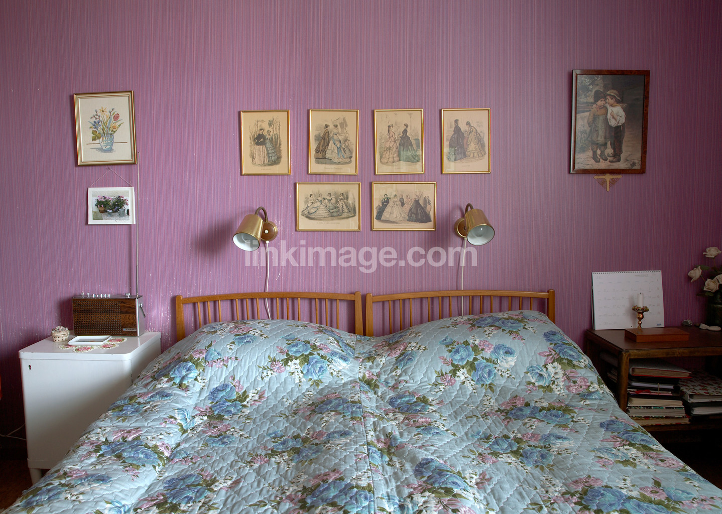 - home, room, bedroom, bed, purple, plaques, interior, wallpaper, flowers, bedspread, older