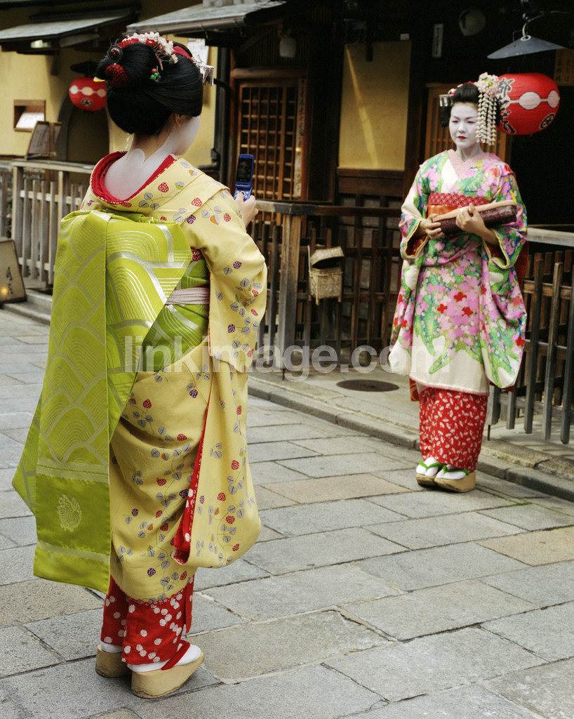 - geisha, photographer, cellular phone, tradition, photograph, kimono, mobile, women