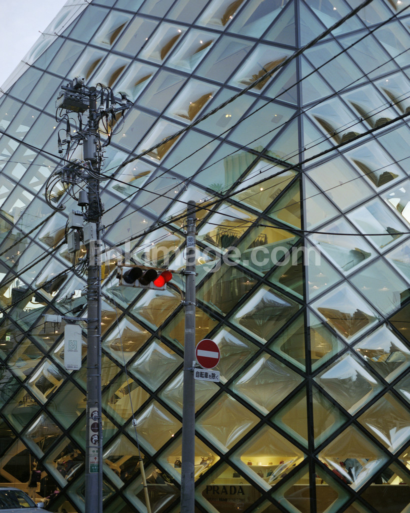 - prada, department store, clothes, fashion, glass, steel, traffic lights, architecture, window, happy, aunt, post, lines, cables, squares