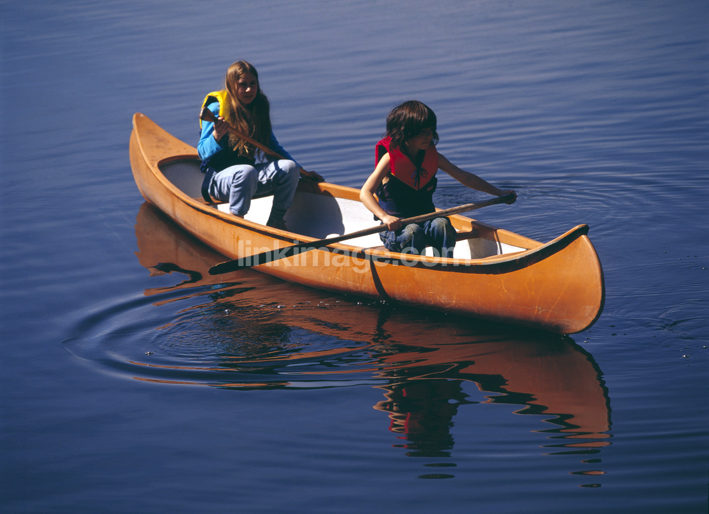 - children, canoe, lake, reflection, transport, communication, leisure, adventure, man, paddle