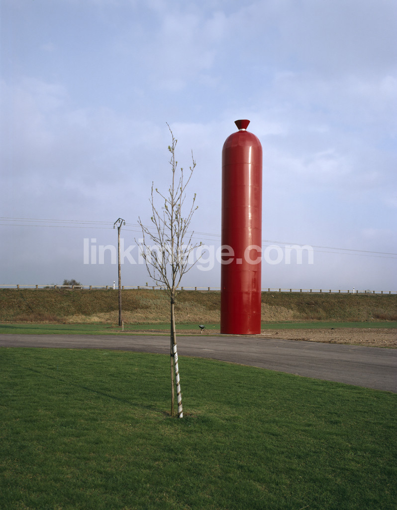 - sausage, large, unnatural, advertising, tree, grass, red, street, road, sky, factory, industrial