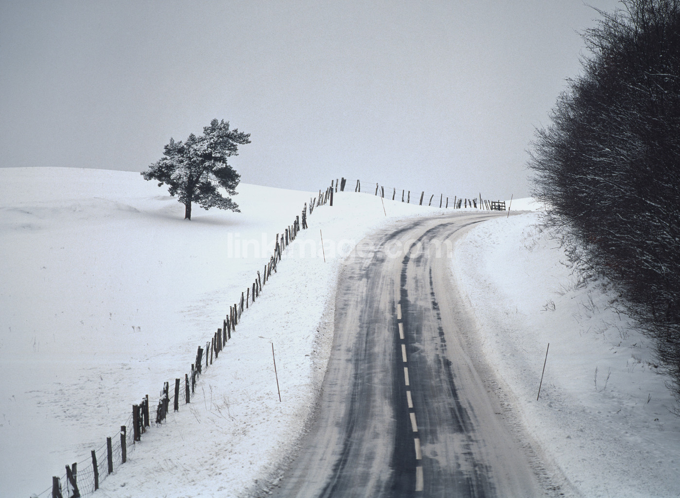 - tree, slope, track, hill start, fence, turn, curve, uphill, plants, transport, communication, road