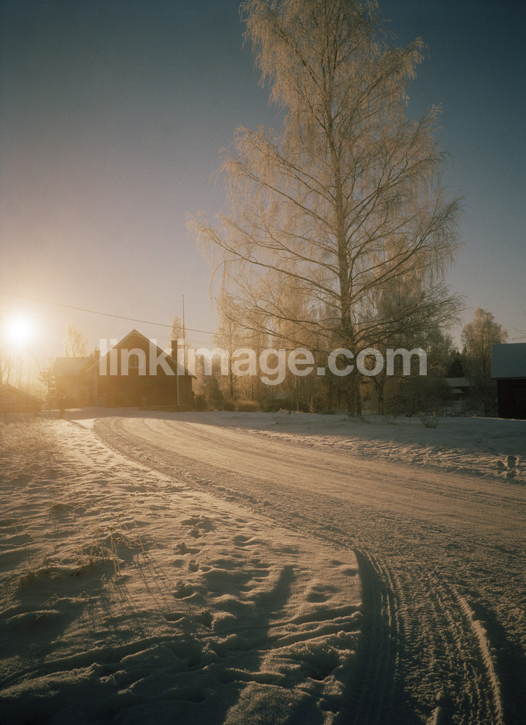 dalarna, sweden, winter, snow, road, house, sunset, evening, winter, track, tree, backlight