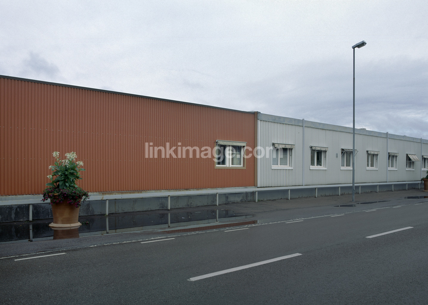- Industrial building and road with houseplant.