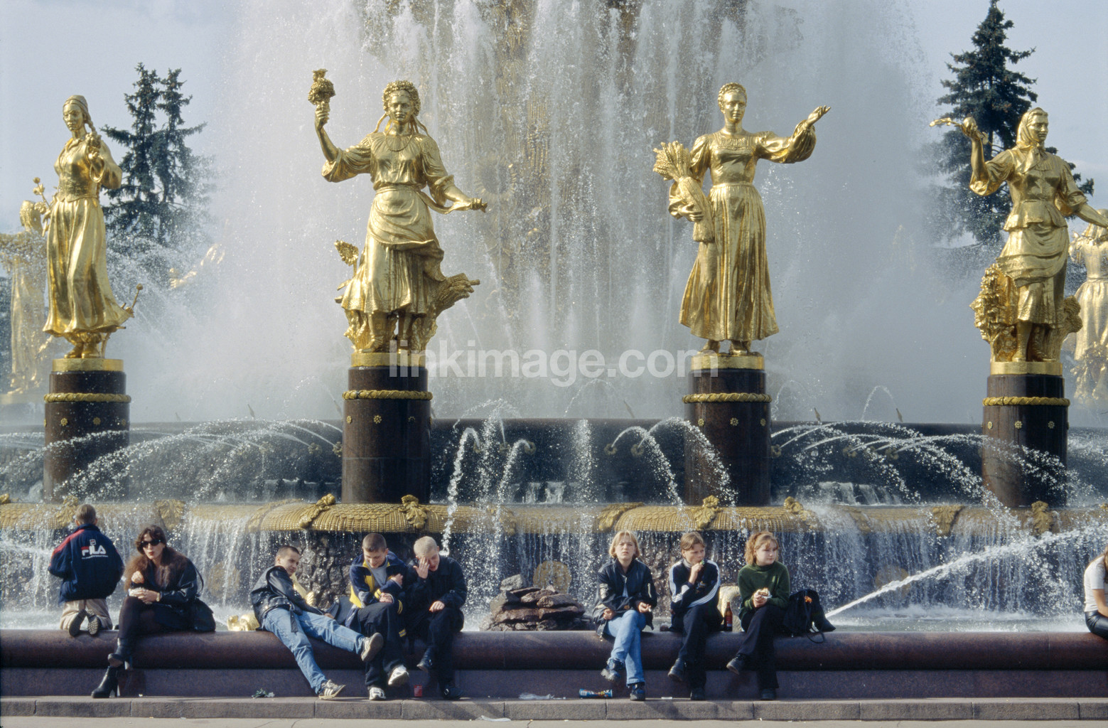 - sculpture, propaganda, water, fountain, people, adolescents, sit, gold, statue