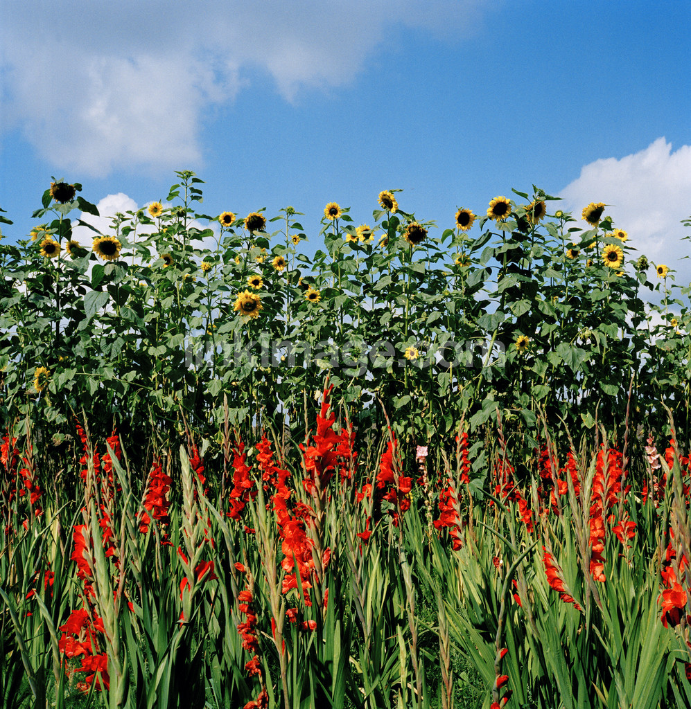 - Gladiolus and sunflowers against the sky
