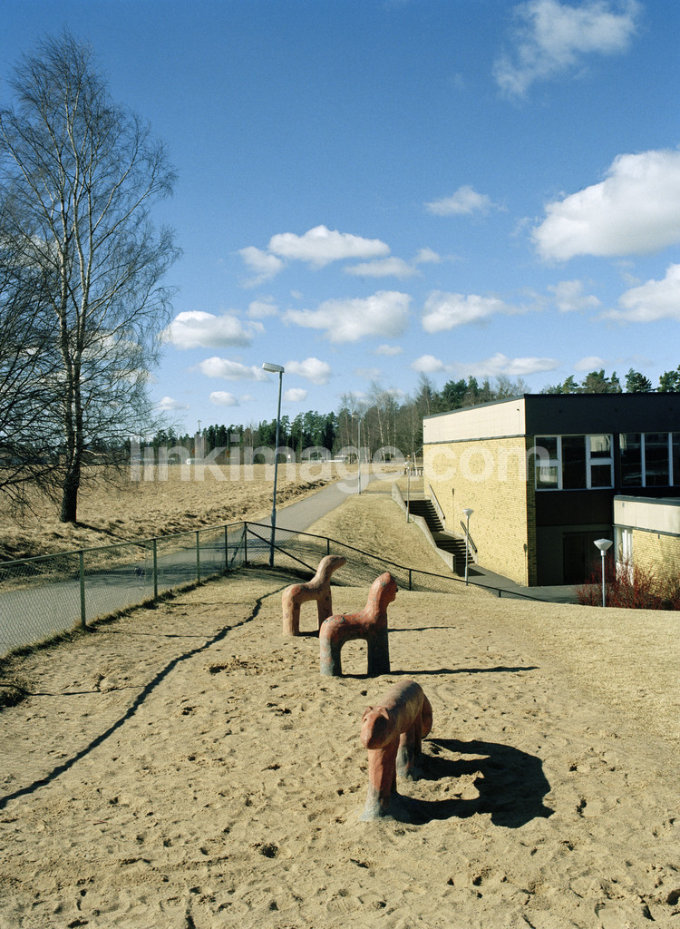- School yard with play sculptures