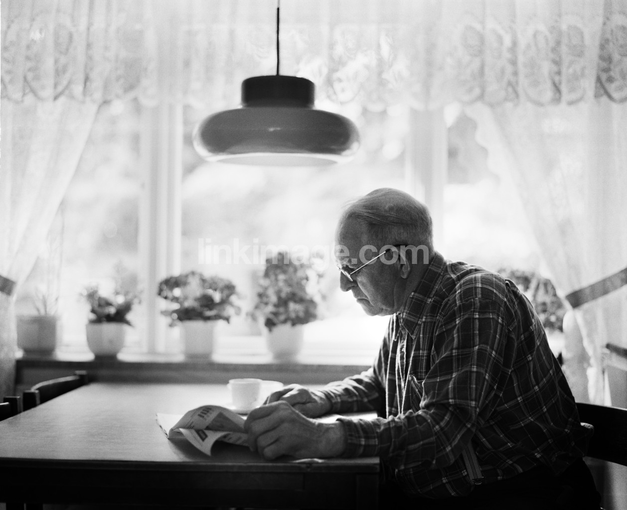 - kitchen, table, reads, journal, male, alone