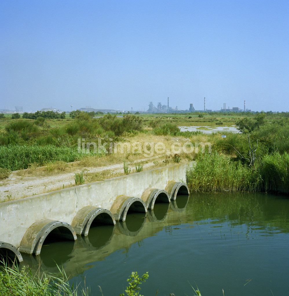 - water, tube, conservation, pollution, bridge, plants, nature, sky, city