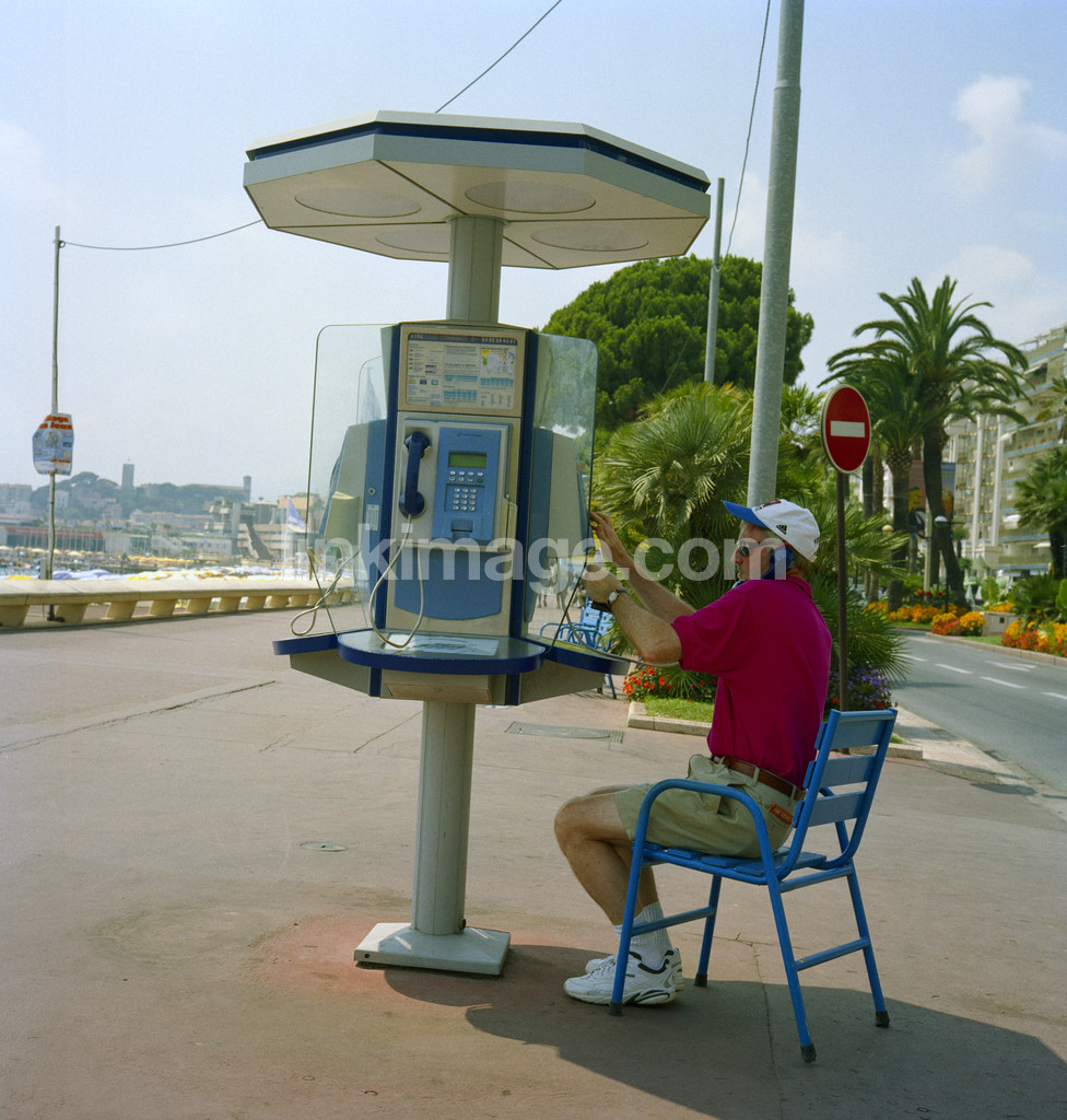 Seated man at the payphone