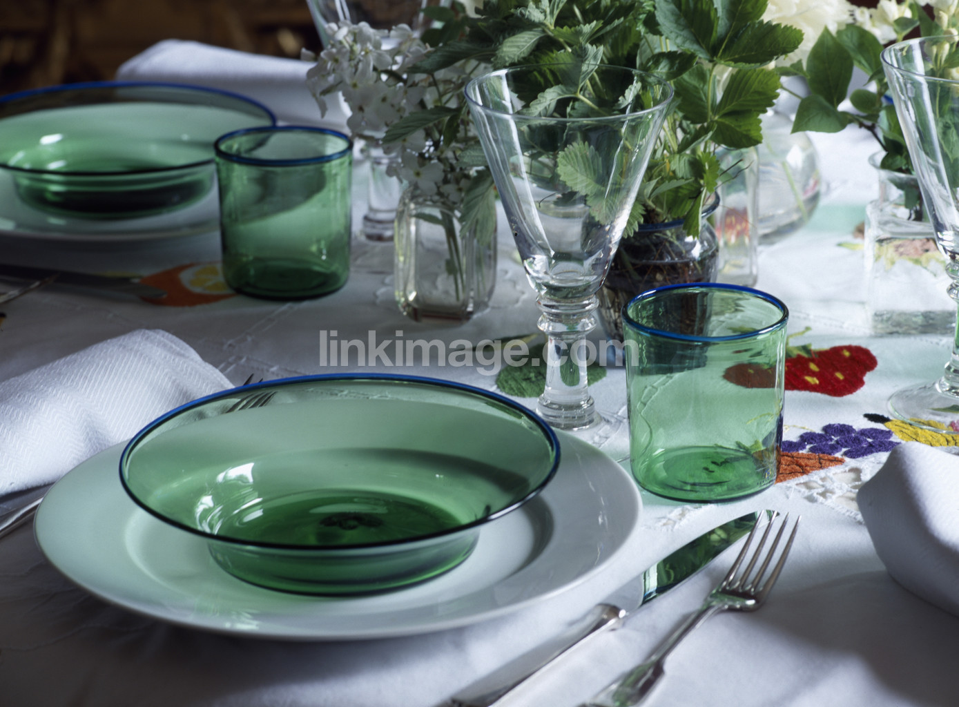 - Table set with green glass