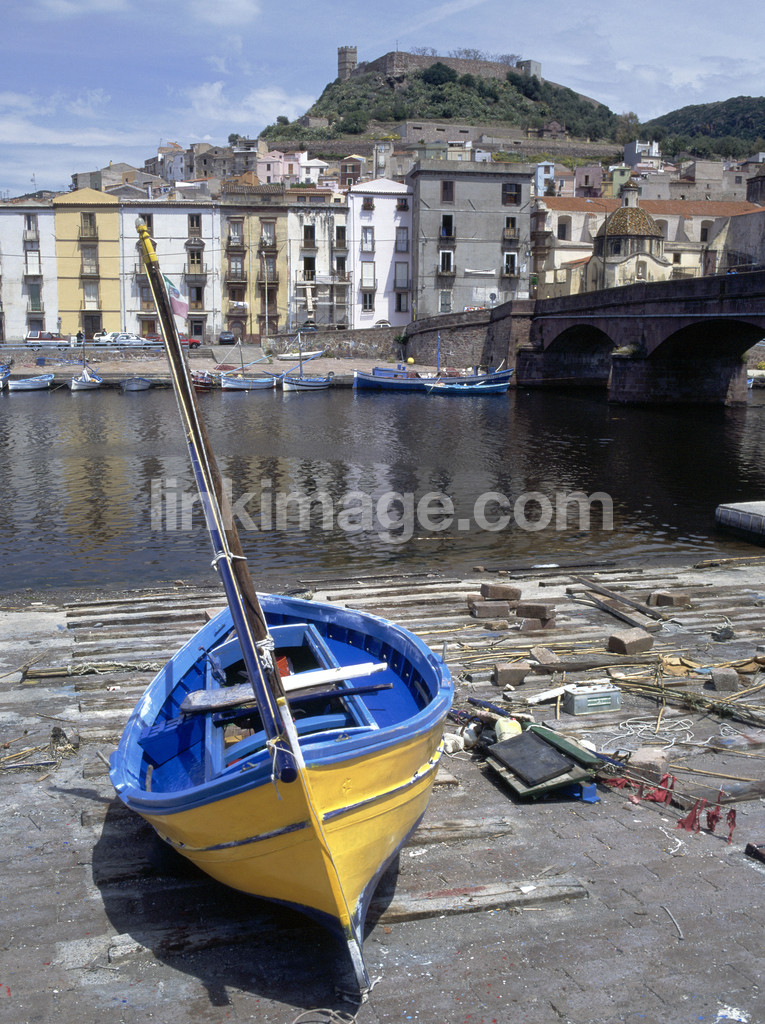 - boat, fishing boat, city, river, hill, house, mast, landed, bridge