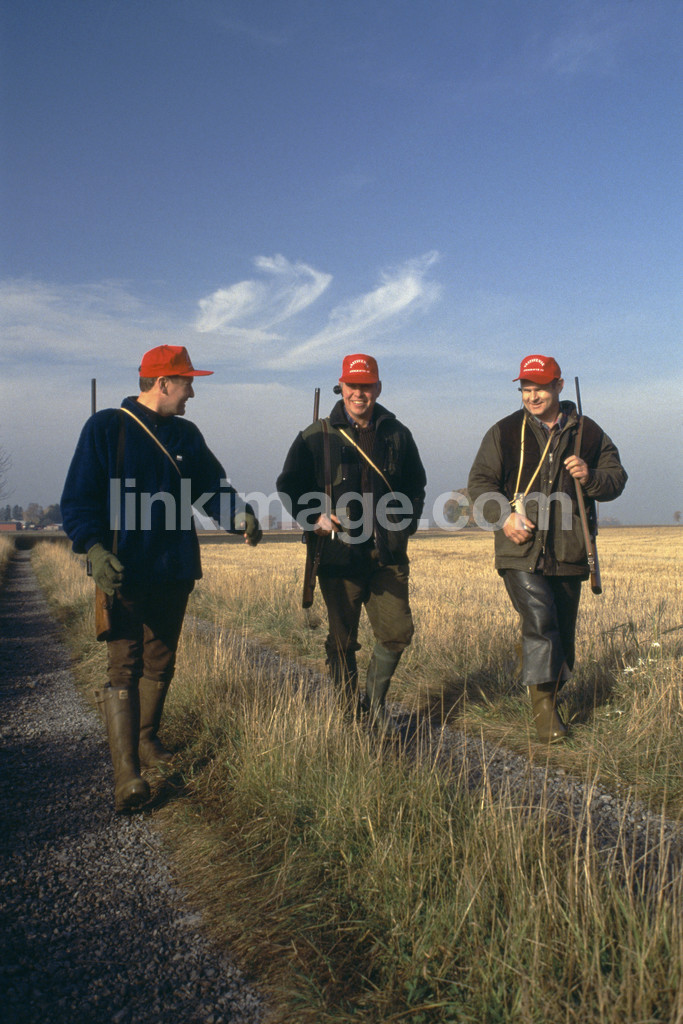leisure, hunting, gun, meeting, hunter, friends, peers, cap, field, three