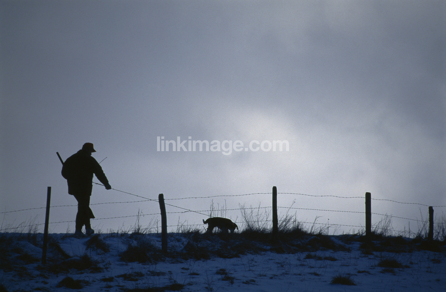 - cropland, snow, winter, leisure, hunting, gun, bloodhound, hunter, chase, fence, dusk, night, shadow