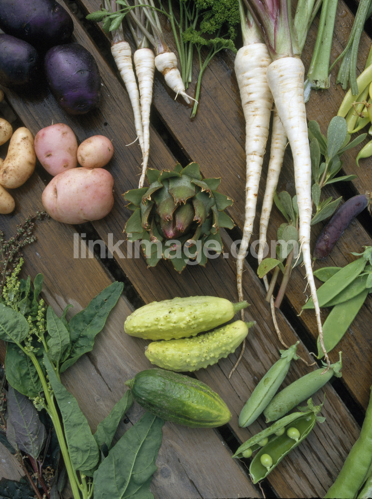 - food, vegetables, cucumber, potato, artichokes, peas, root, wood, planks