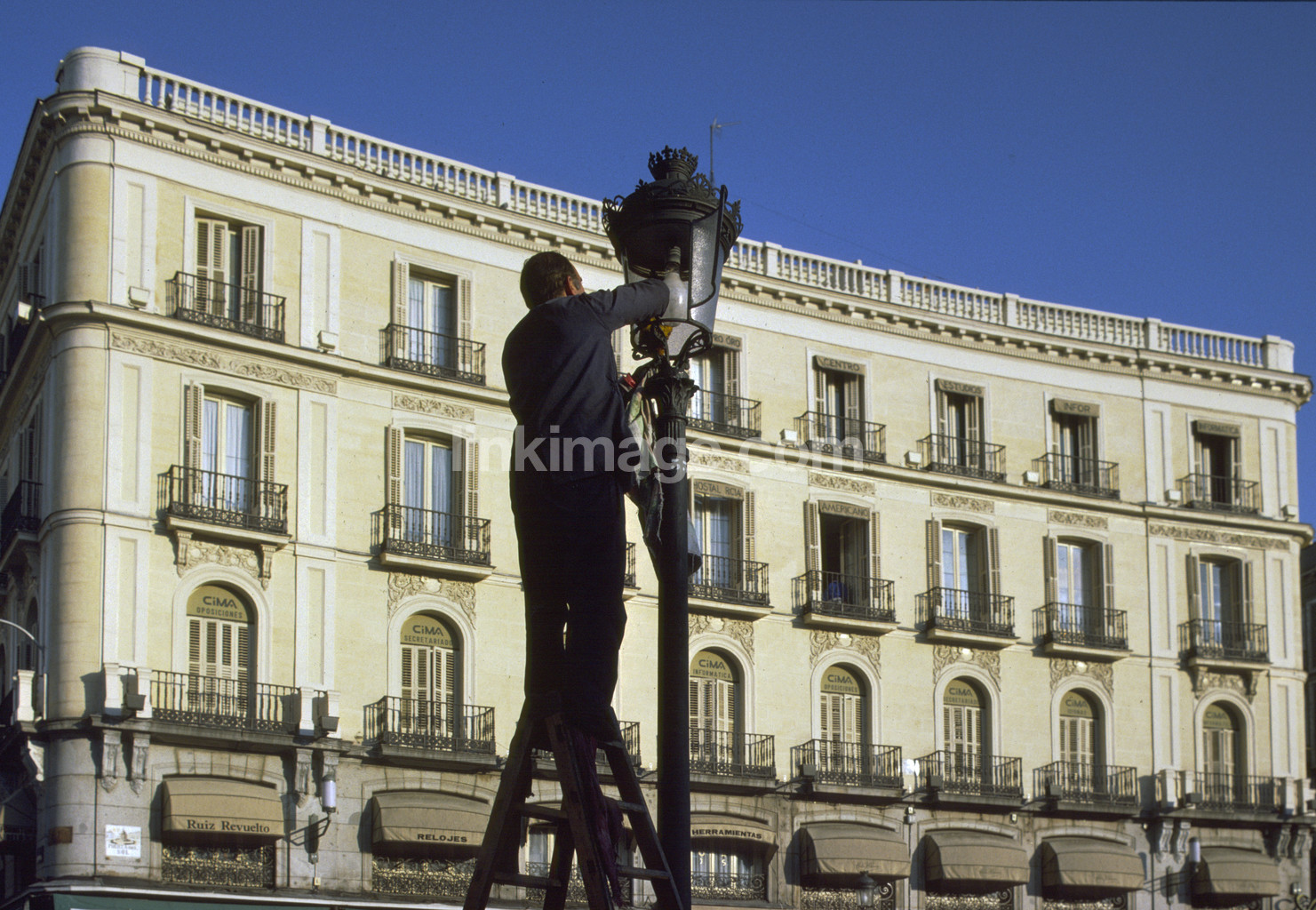 Streetlights at the Puerta del Sol washed. Madrid. Spain
