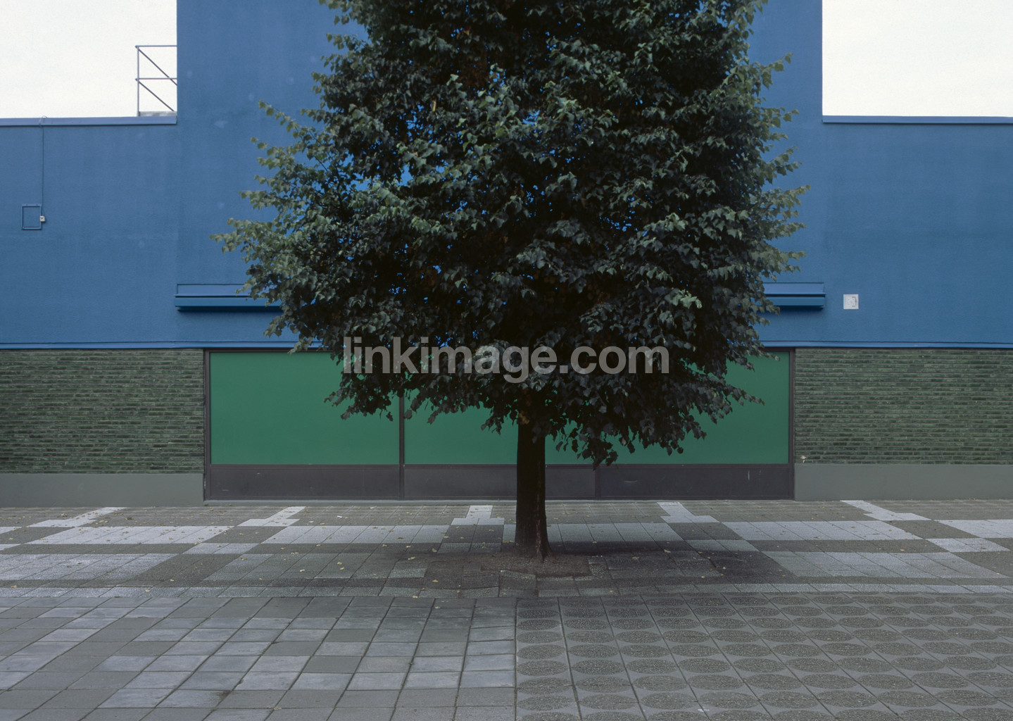 - plants, tree, bushes, pavement, pedestrian, blue, greens, wall