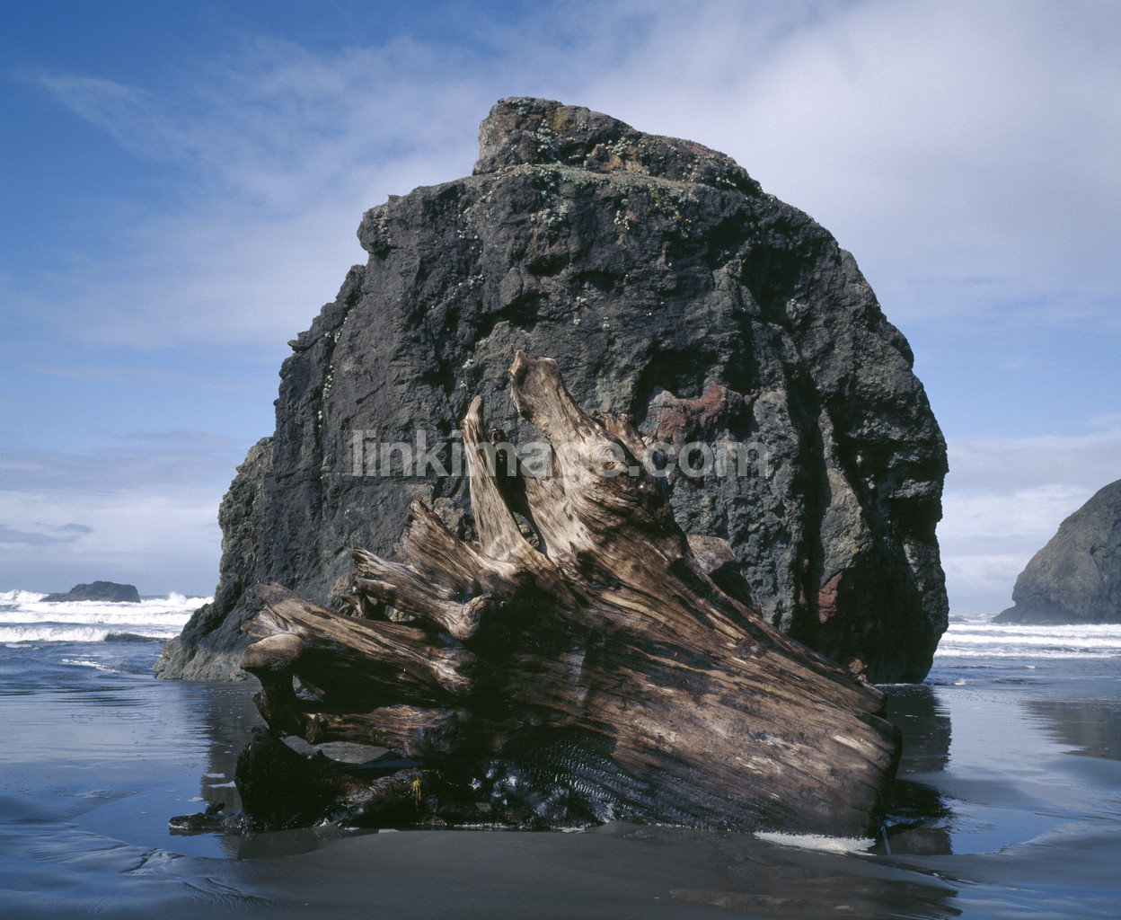 - nature, shore, sky, sand, trunk, sea, stump, root, coiled, waves, island