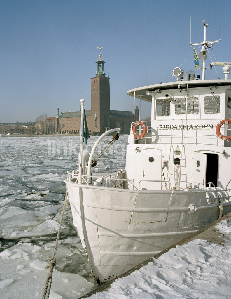 Boat in front of City Hall. Ice, snow, winter. Stockholm