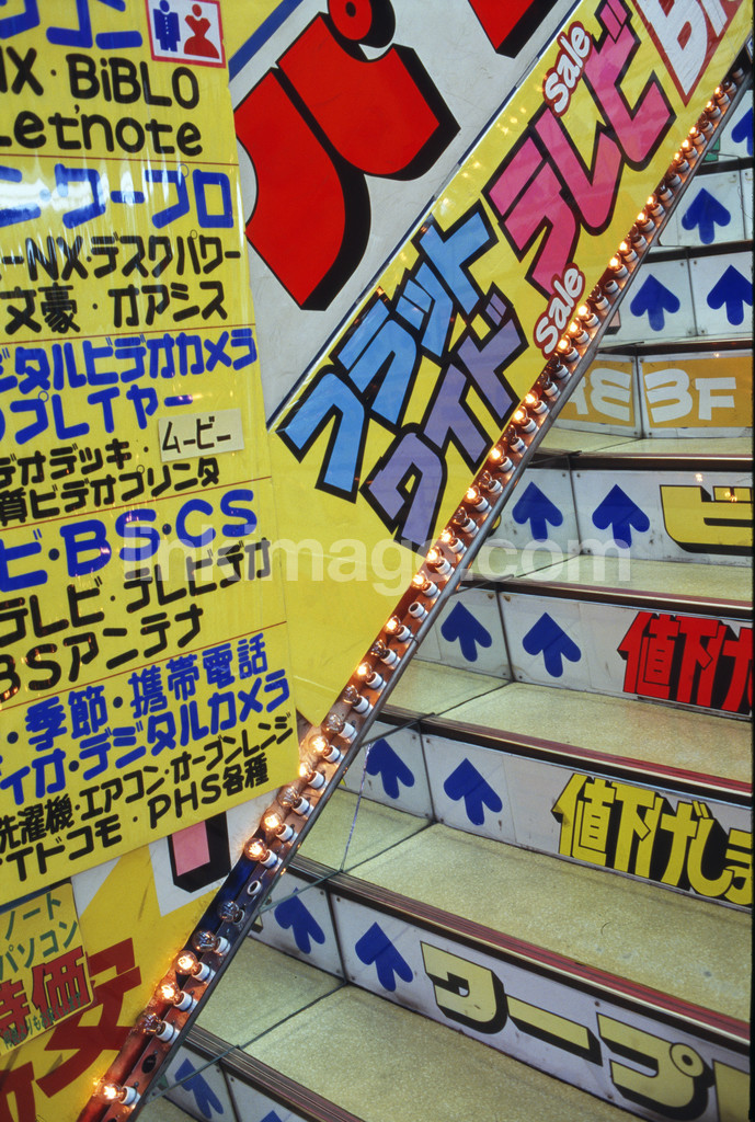 - signs, advertising, staircase, arrows, characters, text