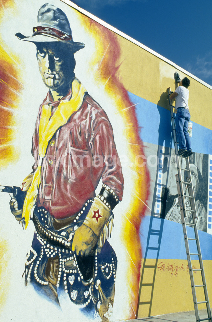 - culture, film, photography, cowboy, painter, violence, idol, movie star, revolver, façade painting, ladder