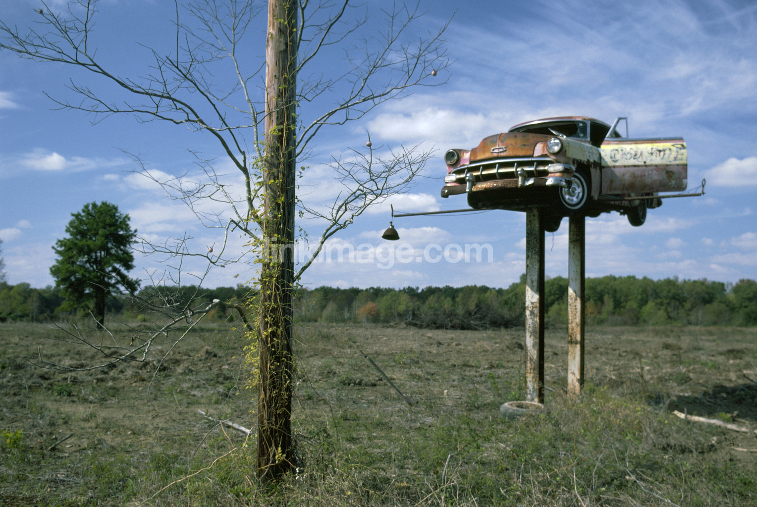 - car, tree, advertising, sign, column, spot