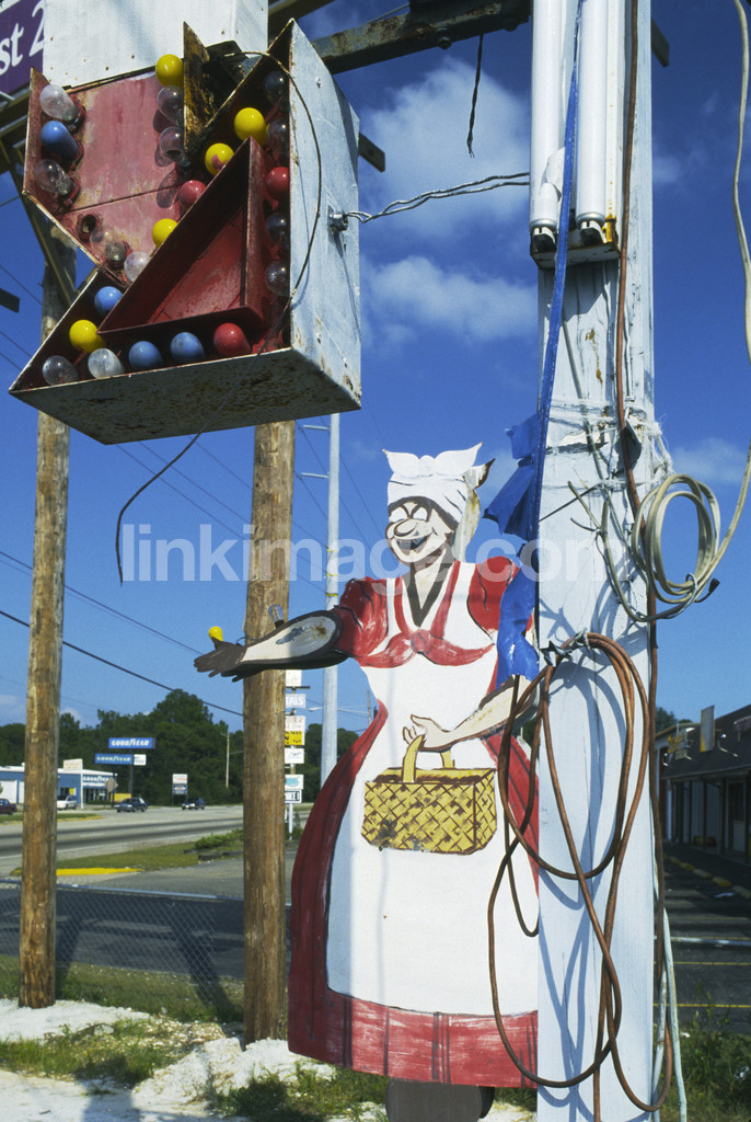 - advertising, signs, arrow, old woman, el, cords, lights, roadside