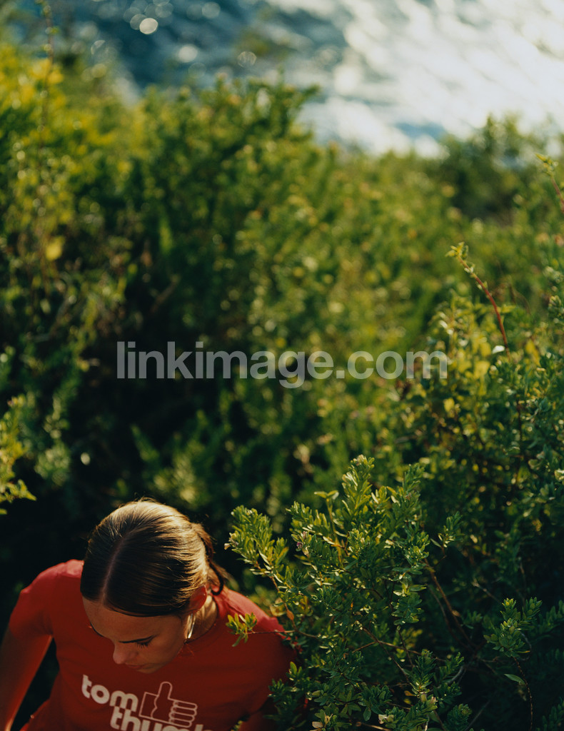 - greenery, shrubbery, bushes, water, sea, female, orienting, red, sweater, go, walk