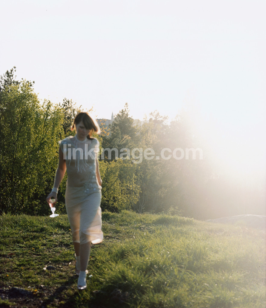 - party, breast, picnic, dressed in evening dress, up, dressed, grass, mat, hill, greenery, against, light, go, walk, transparent, backlight