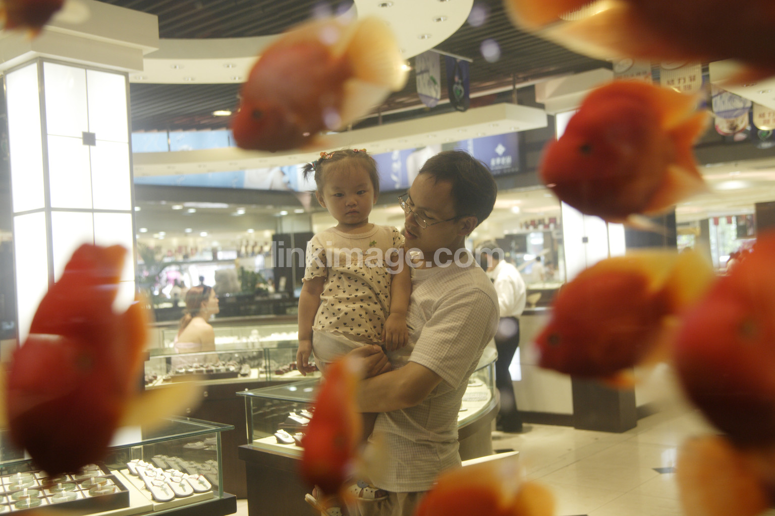 - family, father, daughter, show, restaurant, sushi, gold, fish, aquarium, portrait