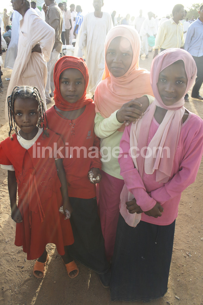 - four, children, girls, girls, red, pink, crowd, market