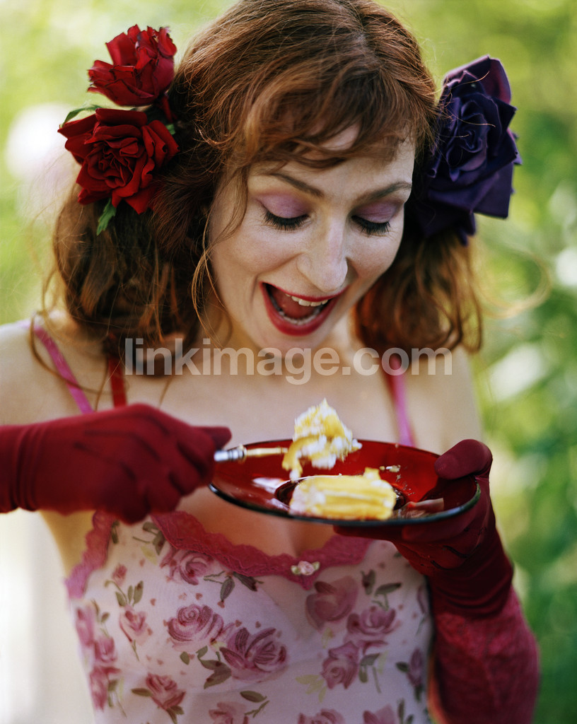 - cake, pastry, summer, else, joy, taste, female, happy, smile, gloves, rouged, eat, eating
