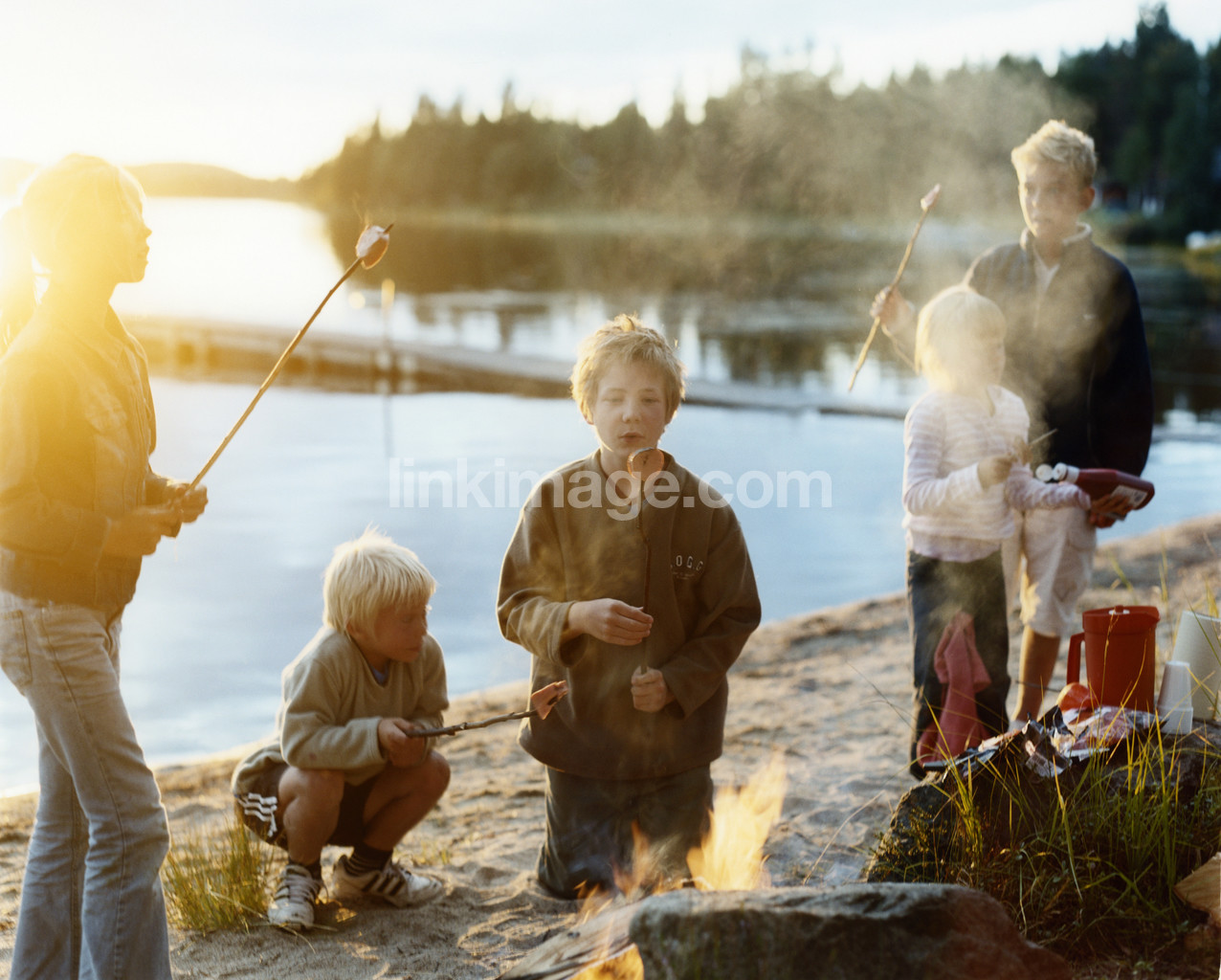 - family, siblings, bbq, grilling, fire, sausage, falu, juice, eww, bridge, summer, five, evening, sun, decline, camp