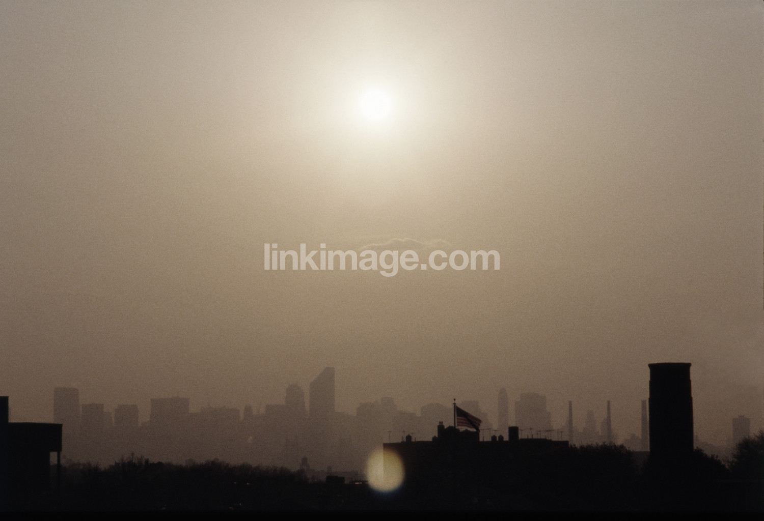 - manhattan, new, york, skyline, silhouette, city, metropolitan, flag, star spangled, banner, haze, sunshine, smog, buildings, mirage, skyscrapers, fog, blurred