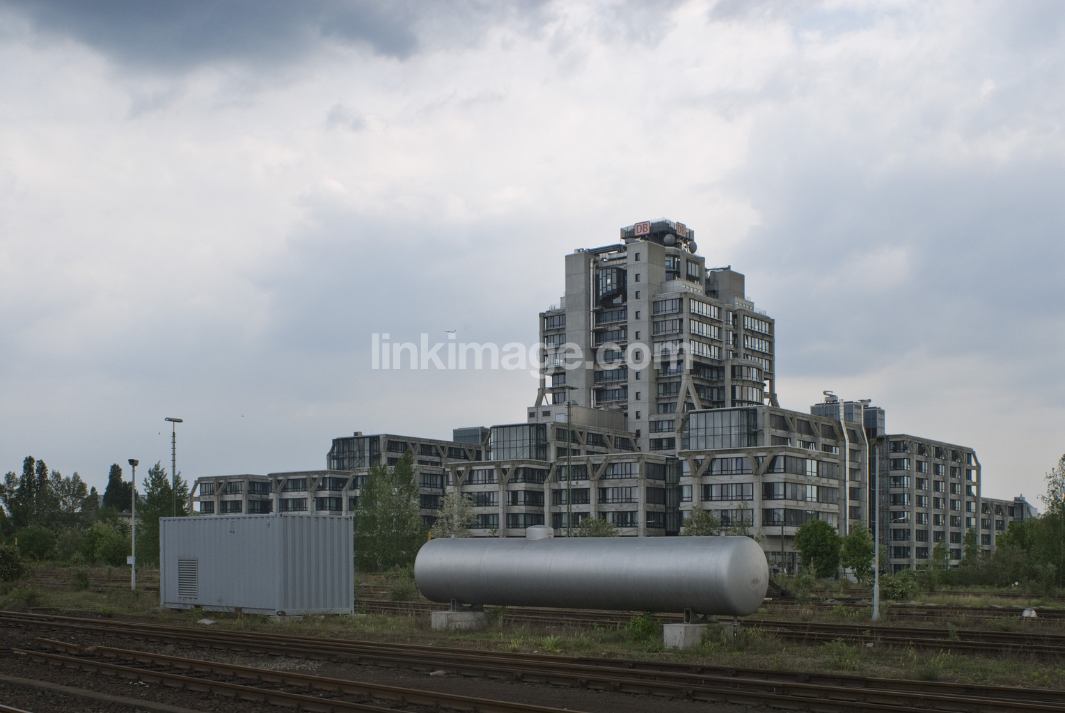 - building, architecture, energy, railroad tracks, cloud, overcast, rail