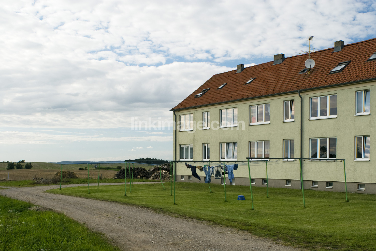 - Residential building with laundry out to dry