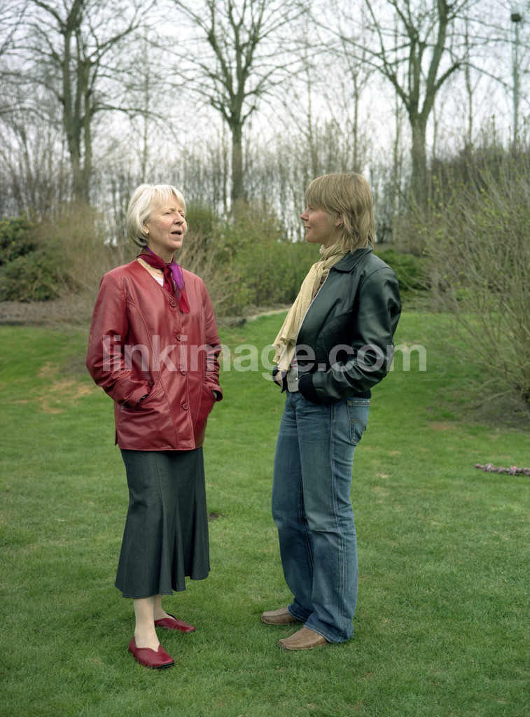 call, female, standing, older, young, jacket, generations, two