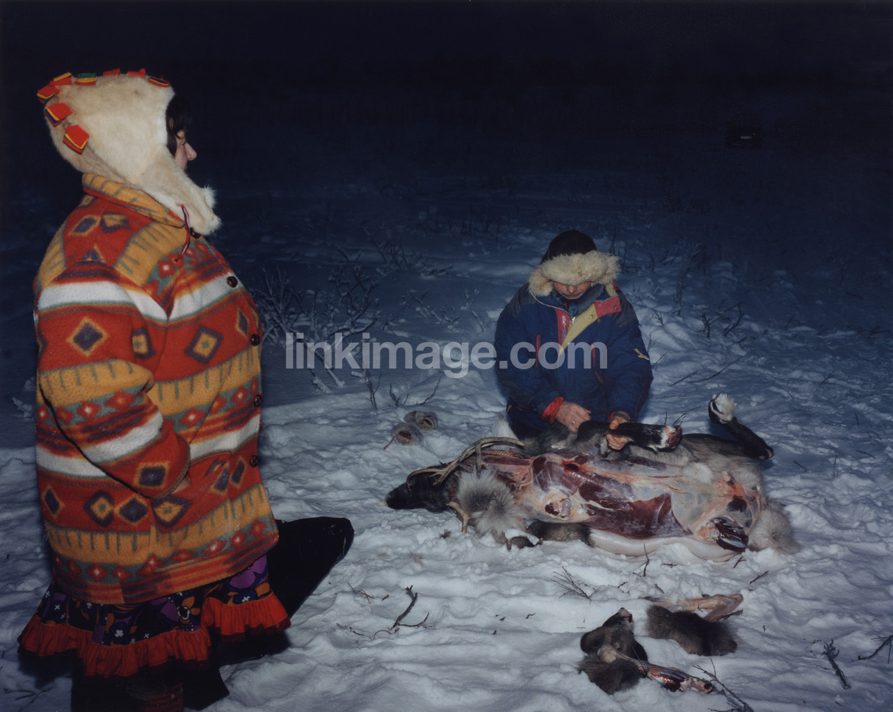 clean, reindeer herders, slaughtering, butcher, winter, snow, cold, night, evening, hunting, death