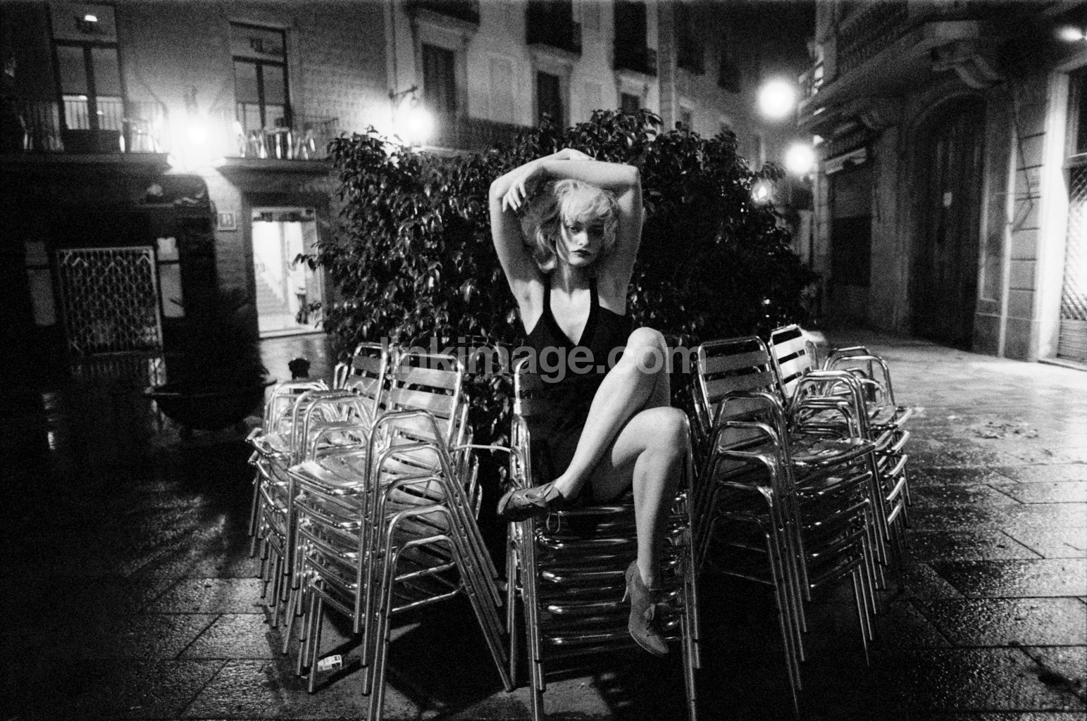 - female, evening, night, portrait, chair, cafe, square, alone, fate, chairs, stacked, sitting