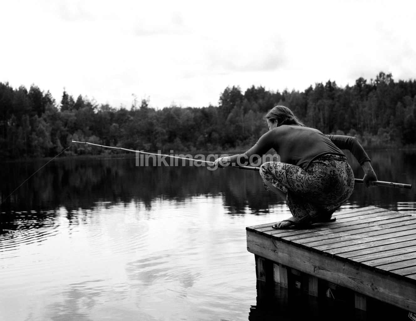 - water, fishing, nature, summer, sky, tree, girl, female, fish, bridge, småland, lake, fishing rod, forest