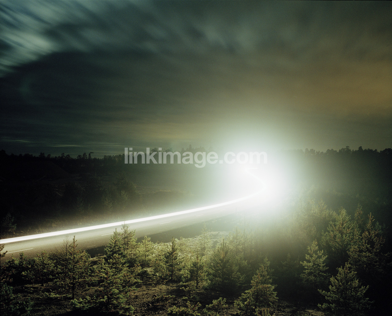 road, night, evening, car, forest, spruce, light, backlight, speed, recording, go